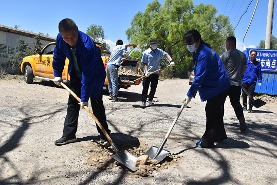 在修路過程中,大家分工合作,有的揮舞鐵鍬平路,有的裝卸運送沙石,有的修補整平路面。盛夏時節,天氣炎熱,黨員和積極分子們熱情不減、干勁十足,經過3個多小時的共同努力,在臨近中午時分,從村口到村委會門前主道水泥路所有坑洼地帶都修補了一遍,坑洼不平的道路補修平整。