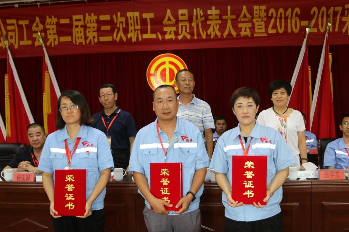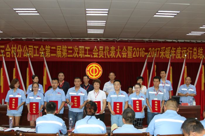 2016年,三合村分公司在全體職工的共同努力下,供熱平穩運行,為熱用戶提供了優質服務,圓滿完成指標任務。同時,分公司涌現出一批團結協作、友愛互助的先進集體和愛崗敬業、勤奮工作的干部職工。大會授予設備材料處、水化車間、運營二所3部門“呼市城發三合村分公司2016-2017采暖年度先進集體”榮譽;授予賈玉玲、郭建軍、林敏3名同志“呼市城發三合村分公司2016-2017采暖年度優秀干部”榮譽;授予郭少鵬等16名同志“呼市城發三合村分公司2016-2017采暖年度勞動模范(先進工作者)”榮譽稱號。城發公司黨委副書記、工會主席張永同志、城發公司常務副經理史繼文同志、城發公司工會副主席薛景翠同志、分公司張學文經理、娜仁副經理、鄭凱副經理、王俊平副經理為受表彰員工辦法了榮譽證書及獎金。