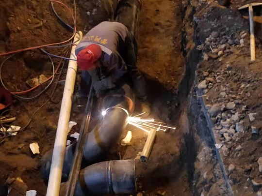10月15日早晨7點,檢修人員在巡線中又發現了第二處漏點,位置在原搶修基坑西側3米的地方。針對此情況,分公司應急指揮小組立即制定應急搶修方案,決定切割銹蝕嚴重的舊管,準備在舊線旁淺埋DN250新管,延長一定長度后,新舊管道向西在合適位置連通,起到臨時管線的作用。由于地下管線錯綜復雜,施工條件惡劣,經過一周的晝夜奮戰,于10月20日下午,完成了搶修任務,新舊管路連通恢復正常使用,搶修工作告一段落。