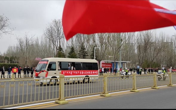 12時許,黨員干部職工來到指定地點(diǎn),融入到熱情的歡迎隊(duì)伍中。隨著警車的警笛聲響,醫(yī)療隊(duì)的巴車緩緩駛向新華大街,大家按捺不住激動的心情,揮舞著手中的國旗歡呼喝彩,夾道歡迎援鄂醫(yī)療隊(duì)白衣天使平安歸來,向白衣執(zhí)甲的無畏勇士致敬。