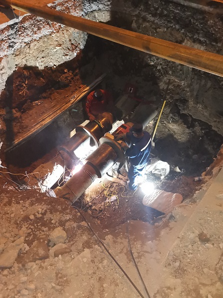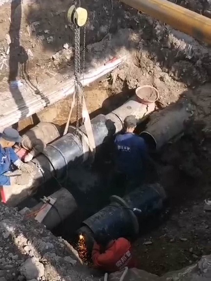 分公司按照管網(wǎng)搶修預(yù)案,組織安排檢修人員即刻關(guān)閥門泄水,還組織保運搶修單位對漏點處進行開挖。在管網(wǎng)漏點處,發(fā)現(xiàn)DN350管道固定節(jié)腐蝕損壞,出現(xiàn)多處漏點,需更換固定節(jié)。整個工作現(xiàn)場忙而有序進行,3個焊工同時作業(yè),切割、拆舊、對接、焊接一氣呵成。