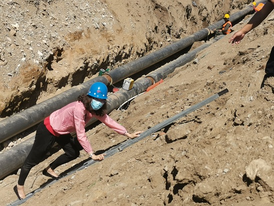 筆者帶好安全帽,也順著工人們下溝的唯一路徑——一個(gè)近乎垂直立在溝邊梯子下到溝里,每走一步,周圍的土就在“簌簌”的往下掉,筆者的心也跟著這些土渣心驚膽戰(zhàn)。來(lái)到管道溝里,兩根粗粗的管子并排向遠(yuǎn)方延伸去。管溝雖然深,但是并不寬,作業(yè)空間不大。