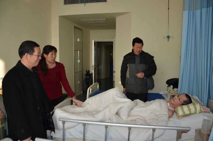 (城發公司副總經理史繼文、武云等領導來到內蒙古國際中蒙醫院慰問躺在病床上的金橋熱網職工劉劍鳴。李波攝)