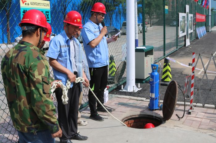 本次演練是以城發供熱三合村分公司所屬愛民街一次管網K1井因在嚴寒天氣管道介質溫升快、壓力高,造成一次供熱管網法蘭結合處拉伸開裂,造成熱水泄漏溢出,搶修人員在接到通知后進入現場進行搶修。在搶修過程中,因井內通風時間短,致使下井人員中一人腦部缺氧發生短時性休克,生命受到威脅為情景。演練分報告、應急響應、應急處置、應急配合、應急終止等科目。