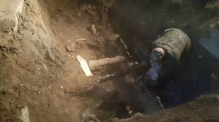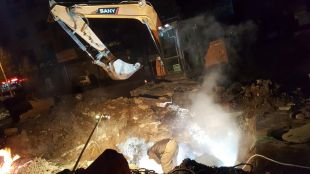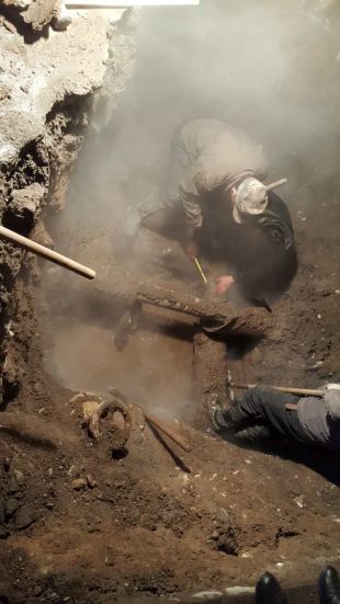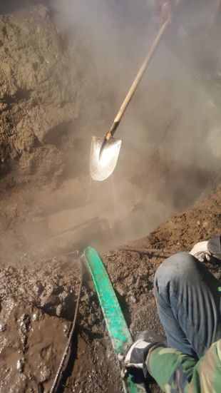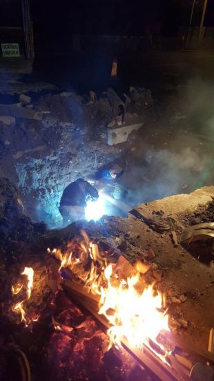 下午2點(diǎn),開(kāi)始挖坑找漏點(diǎn),邊抽水邊挖,挖出熱力管道。分公司經(jīng)理阮強(qiáng)、副經(jīng)理陳龍到達(dá)現(xiàn)場(chǎng)指示:去除保溫,找到漏點(diǎn)。隨即檢修人員關(guān)掉統(tǒng)計(jì)局街西端DN300閥門(mén),準(zhǔn)備泄水搶修。由于閥門(mén)關(guān)閉不嚴(yán),水溫太高,人工無(wú)法繼續(xù)開(kāi)挖,只能調(diào)來(lái)挖機(jī)進(jìn)行搶修作業(yè)。經(jīng)過(guò)2小時(shí)的人機(jī)配合,終于挖出管道 ,發(fā)現(xiàn)在供熱管上方有一大一小兩個(gè)漏點(diǎn),局部腐蝕嚴(yán)重。經(jīng)過(guò)商議,確定在在原有管道上加套管,帶水焊接。