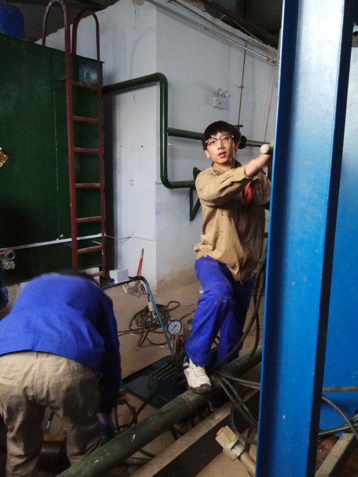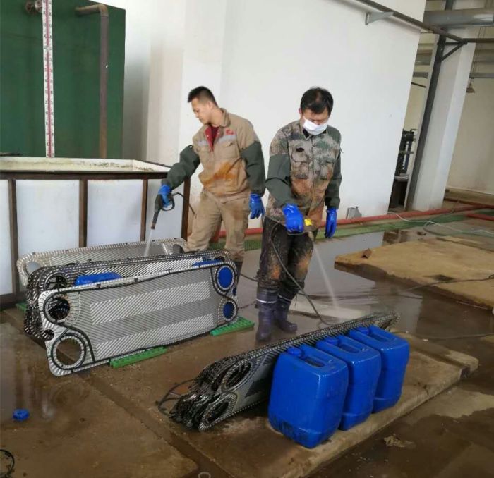 清洗板式換熱器是一項繁重而艱苦的體力勞動,尤其是地下站,清洗板換所用液壓扳手,電機同液壓變速器加起來將近200斤重,都要靠小伙子們抬著上下樓梯,小伙子們吃苦耐勞一點怨言也沒有。由于地下站本身就通風(fēng)散熱不好,工作環(huán)境溫度極高,尤其 州一期熱力站,室溫接近35℃,剛剛干了一小會兒,衣服就全被汗水打濕了,小伙子們只能不停喝水降溫,穿著濕漉漉的衣服繼續(xù)工作著。