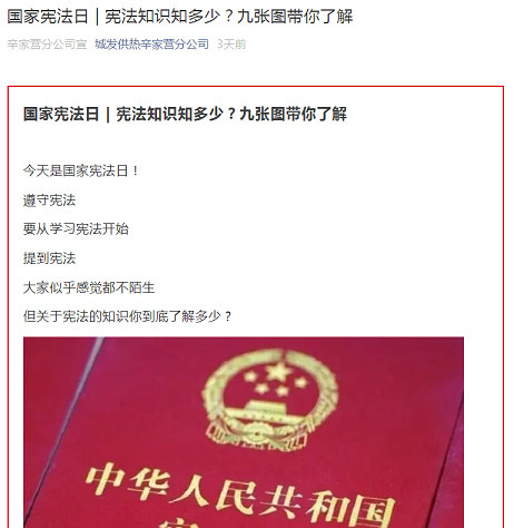 本次活動以線上宣傳為重點,圍繞活動主題開展多層次普法宣傳活動。黨員干部通過學習強國平臺,線上學習憲法知識、黨的十九屆五中全會精神、疫情防控等相關法律法規及習近平法治思想等重要論述。分公司運用微信公眾號及微博平臺,推送憲法基礎知識及宣傳標語、海報等。利用LED滾動屏播放憲法宣傳標語,形成了良好的宣傳氛圍。
