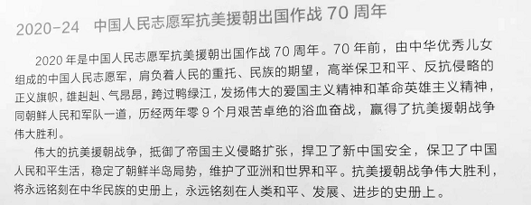 圖16:《中國人民志愿軍抗美援朝出國作戰70周年》紀念郵票簡介