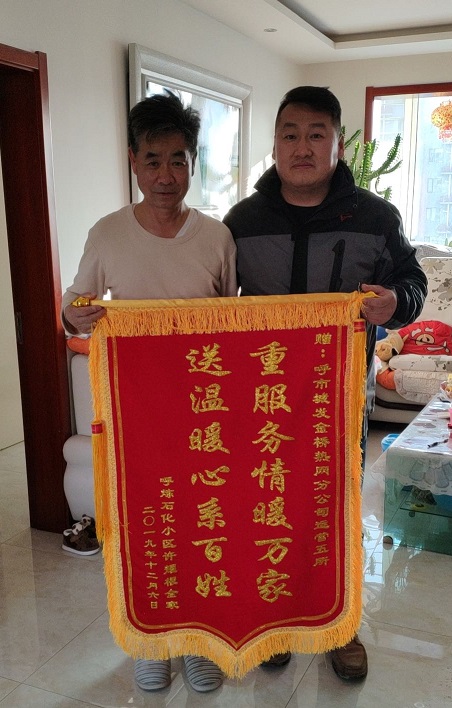 12月24日,呼煉石化小區熱用戶許耀根將寫有“重服務情暖萬家 送溫暖心系百姓”的錦旗送到了金橋熱網分公司運營五所運行所長周峰手中。