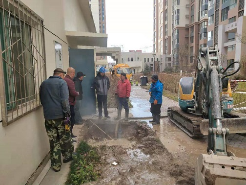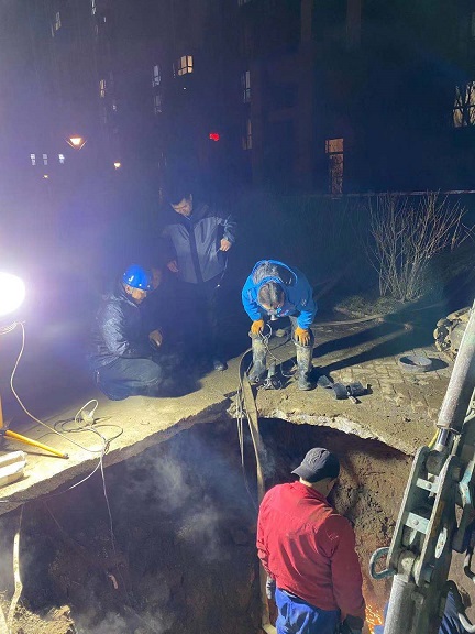 19日一早,五所當班檢修人員趕赴熱力站開始排查漏點,同時通知保運單位人員與天然氣工作人員盡快到位,配合修補工作及檢查線位。分公司副經理張國梁赴溢水現場指導搶修工作。10:52查到漏點為萬達二組團熱力站一站一次網進站直埋管跑水,做好一切準備工作后,開始挖掘路面,同時所長郝衛紅、收費主任李婧組織所有催費員在搶修關閉閥門泄水前,將維修停暖通知轉發給萬達客服管家,并將通知親自送到每一個商鋪業主手中,張貼到每一棟樓的單元通告欄里,希望用戶諒解此次搶修給他們帶來的不便。