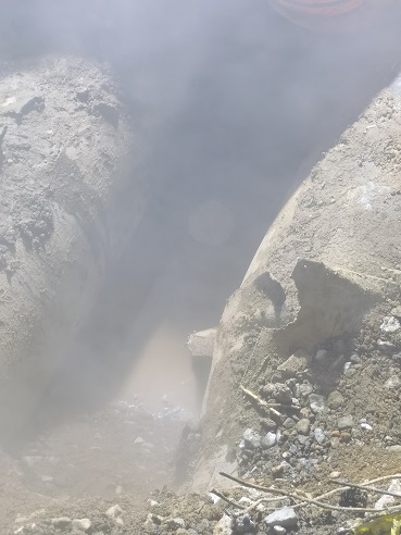 晚上11點,各相關領導準時抵達現場,進行現場指揮作業,由于漏點位于路口中間,既要保證過往車輛通行通暢,又要保護地下既有管線的安全。機械破除水穩層后還對溝槽進行了人工清理,經過2個小時的連續作業,在凌晨1點找到漏點,漏點為排氣的加固套管側面損壞漏水。為了保證居民的正常用熱,決定利用管箍,硅膠板將漏點堵住,保證漏點不再擴大,待嚴寒期過后再做徹底處理。