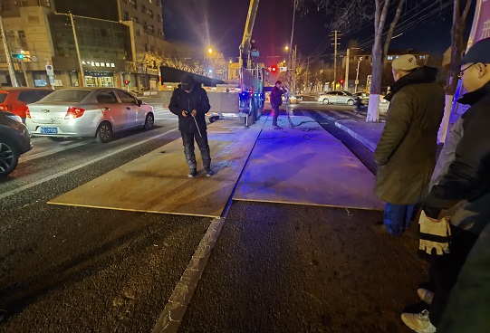 接到電話后,橋靠分公司第一時間派相關人員去現場核實,初步確定為橋靠分公司DN800一次供熱主管漏水。此時室外氣溫為-24℃,正值嚴寒時期,如若立刻搶修可能會影響近500萬㎡用戶的正常供熱,決定待天氣回暖一些再進行搶修。為了保證路上過往車輛的安全,暫時在漏水點處鋪上20cm厚鋼板。