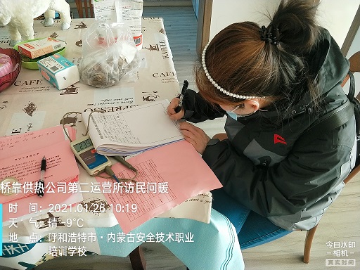 1月30日辛家營分公司客戶服務處、運營三所全體工作人員組織開展 “訪民問暖”。此次活動走訪金泰麗灣小區,共計走訪用戶15戶,填寫了《訪民問暖記錄表》15份、《居民供熱問卷調查表》10份、發放城發供熱服務手冊12本。