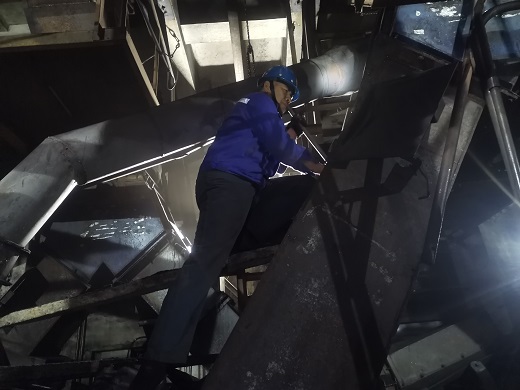 下午3時,輸煤車間像往常一樣準時開始第二次上煤。在班的幾名工人開始鏟煤、疏通、巡查傳送帶。隨著傳送帶緩緩開動,140多噸煤渣陸續被送入鍋爐。大約1小時后,上煤完畢。王燕明爬上距離地面2米的輸煤皮帶機尾下料口處開始清理分篩室溜煤筒的積煤,他告訴筆者,清理積煤,是確保下次上煤的暢通。我們輸煤車間人員在現場的各種機器設備運行時發出的轟鳴聲中,就能分辨出設備細微的運行狀態,準確地判斷出給煤情況,從而及時采取相應措施。