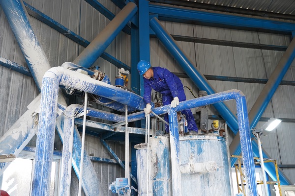 登上脫硫塔后,還沒等筆者從爬樓的狀態中緩過來,姚瑞已經身手敏捷的爬上了設備,開始了對設備運行情況的查看。隨著閥門的轉動,一股白色的泥漿猝不及防地噴到了沒來得及躲閃的姚瑞的身上、臉上。上來時還干干凈凈的人,此刻已經滿身白泥。姚瑞顧不得擦拭臉上的白泥,依舊專心致志的干著手里的活。
