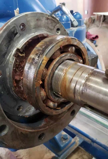 14:30長輸管網運行各相關單位啟動緊急停泵程序,同時調整各相關單位運行參數,協同售后人員現場制定搶修計劃。15:30開始搶修,當班電氣儀表值班人員對10KV電機電源線、0.4KV散熱風扇電源線、水泵參數信號線進行拆卸,廠家人員對水泵前端軸座拆解檢查,確定為軸承冷卻水密封墊損壞導致冷卻水進入到軸承潤滑腔,潤滑脂乳化,銹蝕軸承滾珠造成軸承間隙增大,如果不及時發現并停機,后果非常嚴重。