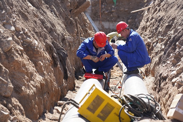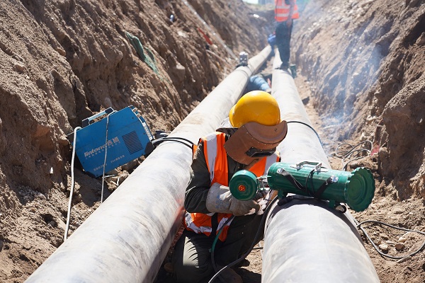 一個(gè)工人師傅,側(cè)身躺在兩個(gè)管道中間的狹小夾縫中,對(duì)管道進(jìn)行焊接。施工單位天津管道公司的段步雨向筆者介紹,“現(xiàn)在這個(gè)師傅做的是第二道工序,叫電焊造面。你看到這么長(zhǎng)的管子,都是一截一截焊接起來(lái)的,焊接要兩道工序,第一道是氬弧焊打底,就是在電弧焊的周圍通上保護(hù)氣體——氬氣,使焊材不能和空氣中的氧氣接觸,從而防止了焊材的氧化,所以第一遍要用氬弧焊,就是為了焊口不生銹,確保它的使用年限。氬弧焊完成后,為了管道外壁齊平,焊口更牢靠,再進(jìn)行第二遍電焊造面。”