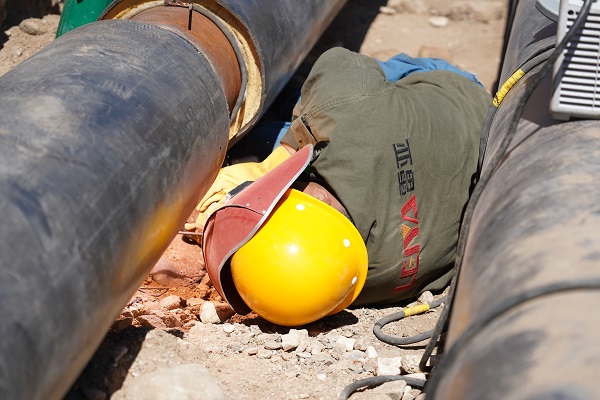 筆者帶好安全帽,也順著工人們下溝的唯一路徑——一個(gè)近乎垂直立在溝邊梯子下到溝里,每走一步,周圍的土就在“簌簌”的往下掉,筆者的心也跟著這些土渣心驚膽戰(zhàn)。來(lái)到管道溝里,兩根粗粗的管子并排向遠(yuǎn)方延伸去。管溝雖然深,但是并不寬,作業(yè)空間不大。