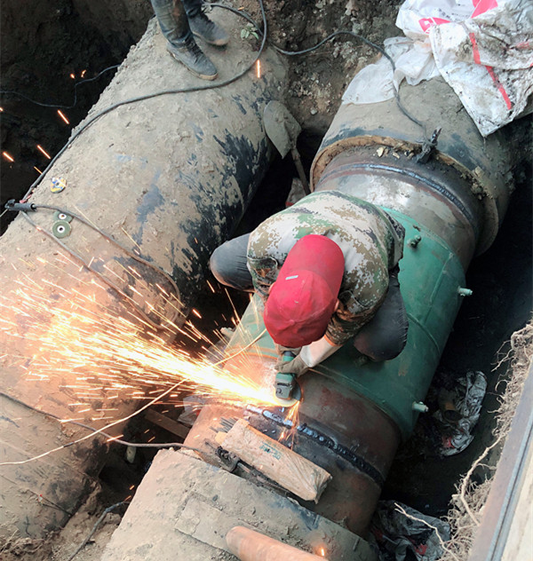 經水樣檢測及GPS定位,確認是補償器漏水,巡檢人員隨即關閉前后段閥門,并將情況上報。分管經理鄭紅飛迅速組織人員進行搶修,于23日上午檢測漏水點為一次網DN800補償器,各單位隨即分工進行搶修。保運單位負責坑道抽水及補償器的切割、打磨工作;檢修車間在漏水點下游進行泄水。