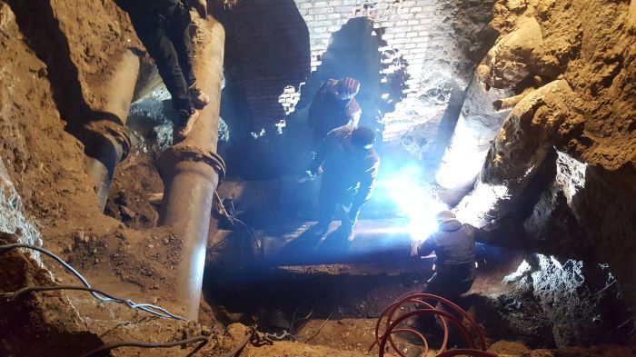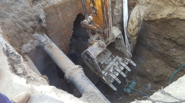 在1月17日19點,施工人員開始進行搶修。檢修人員調來高壓水車對泄水井內降溫,并用吸污車抽水,然后檢修人員下井查看,發現漏點在井外主管上,只能破路進行搶修。同時致電呼和浩特市中燃城市燃氣發展公司客服中心,確定其燃氣管線位置以便于搶修。1月18日20點,分公司領導、生產處人員、檢修車間人員、二所運行檢修人員、外網保運單位的施工人員、中燃工作人員,來到現場進行挖掘搶修。因為供熱管道上方有燃氣管道交叉通過,所以必須人工與挖掘機配合挖掘。19日早晨查找到失水點在管道固定墩內,決定采取拆除固定墩更換管道的辦法修復,關閉三十五中DN350主閥門,內大DN450主閥門,先后影響5座熱力站供熱,停供面積達43萬平米。與此同時,調度將搶修情況告知客服中心,以便客服人員向搶修影響到的熱用戶做好暖氣不熱的解釋工作。1月19日上午,橋靠分公司致函呼和浩特市城市管理行政執法局一支隊、市政公用設施和管線管理局,說明需要進行破路施工搶修的情況。當日中午,大型挖機拆除固定墩,作業人員切除管道時仍有大量熱水涌出,無法作業,研究決定關閉前端DN700球閥并泄水。20日凌晨2點,影響15個熱力站供熱,停供面積達到145萬平米。1月20日14點,取出了固定墩和損壞管道。18點完成管道焊接,隨后為管道注水、打壓,檢查焊口合格后,對管道保溫,回填坑,清理現場。